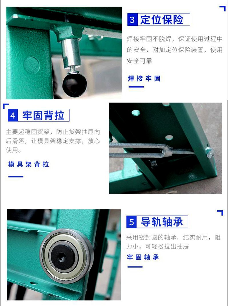 模具货架适合于存放模具等机械加工块的存放。占地少、承重大、分类详细、存取方便。抽屉式滑道,可以80%抽出,操作简易,安全,是现代化工厂的维修及加工车间的工位器具。